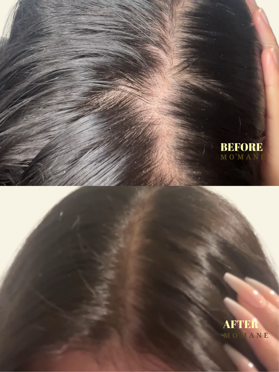 Regular use maintains new growth and strengthens existing hair. Balding or thinning areas may see significant improvement, with hair becoming fuller and denser. Long-term use continues to promote healthy hair growth and scalp balance.